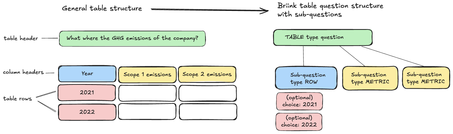 - Create sub-questions for all other, following table columns, e.g. in this example two METRIC type sub-questions for "Scope 1 emissions" and "Scope 2 emissions"