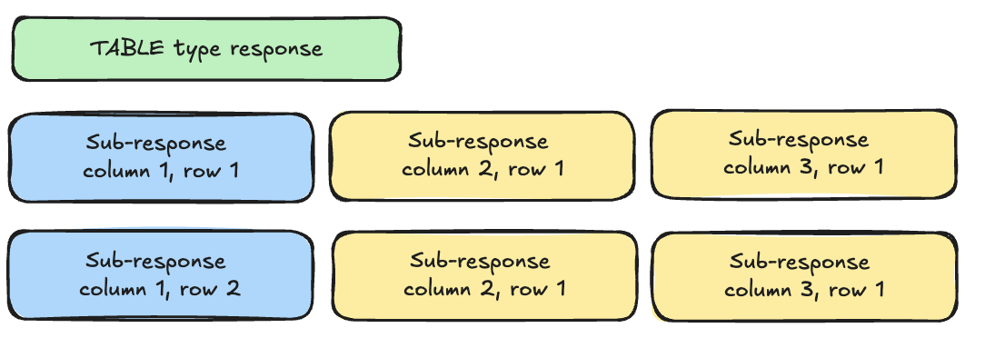 - For each table cell there is an individual sub-response with the same attributes that normal responses have (e.g. response text, evidence etc.). The sort_order attribute of sub-responses defines the column order and the table_row_number attribute the table row number. The sub-responses also have an individual processing status attribute